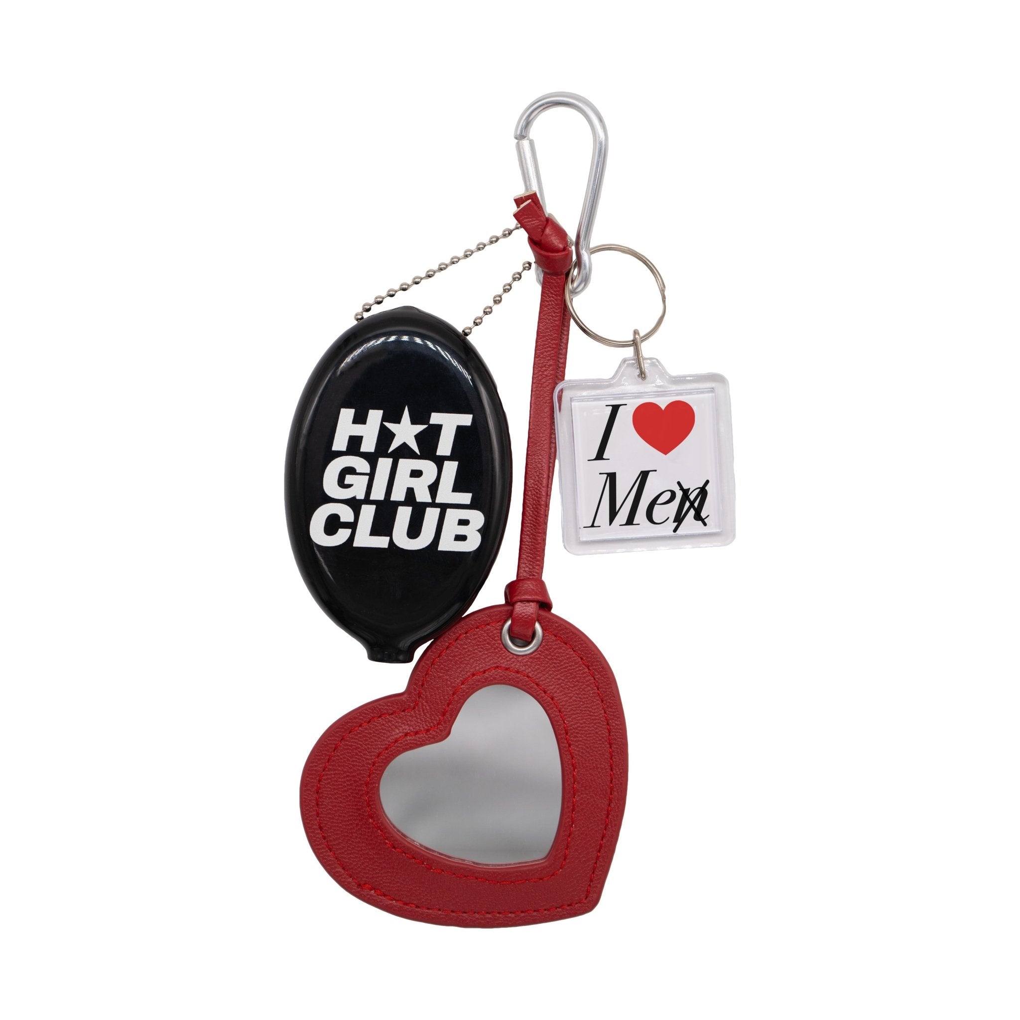 Charm with three pendants: a heart-shaped mirror with red rim, small compartment where you can store small items such as coins with text "Hot Girl Club" and transparent piece with text I <3 Me.